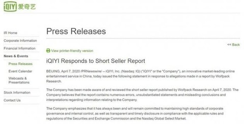继瑞幸咖啡遭到浑水做空股价暴跌之后,爱奇艺遭Wolfpack Research做空。爱奇艺创始人兼CEO龚宇再次回应...